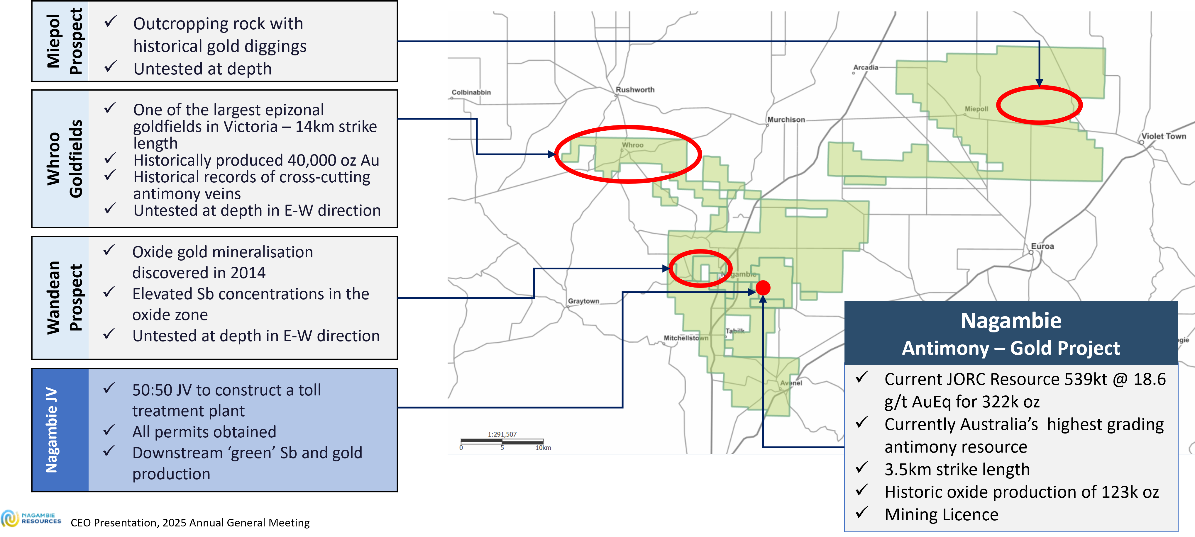 Nagambie Resources Limited (ASX:NAG) is an exploration and development company targeting epizonal-style, high-grade antimony and gold mineralisation across its 1000 sq km contiguous tenement holding in the Waranga Domain of the Melbourne Structural Zone in northern central Victoria, Australia. These tenements are located near the gold-antimony mines at Fosterville (Agnico Eagle) and Costerfield (Mandalay Resources).