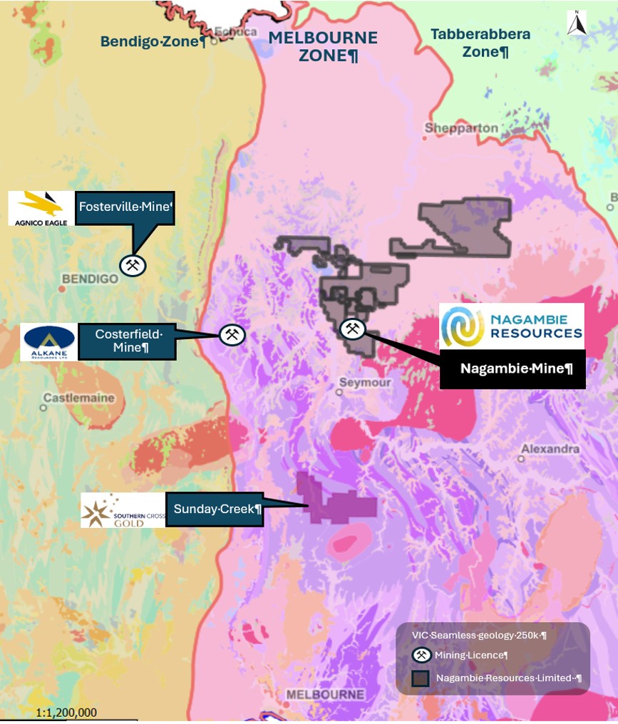 Location map of Nagambie Resources’ tenements (100% owned and JV tenements) in the Waranga Domain of the Melbourne Structural Zone